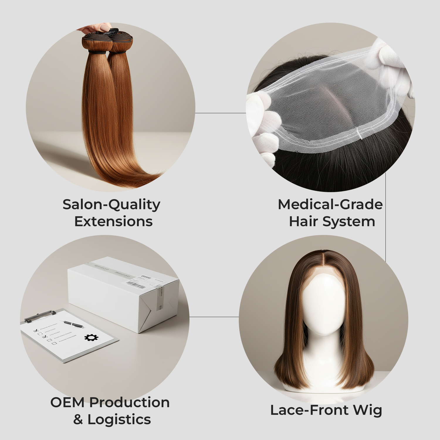 Our R&D team works closely with brand partners to create exclusive wig and extension designs — customizing cap structures, color blends, and packaging to fit your market.